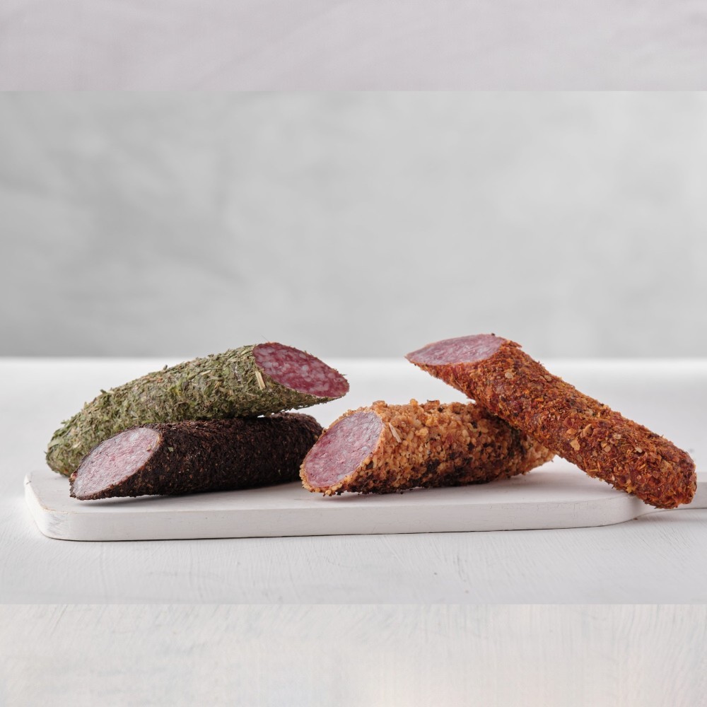 The fuet pack consists of four half-sticks of fuet coated in different flavors: garlic, sun-dried tomato, fine herbs, and black olives. It weighs approximately 360g